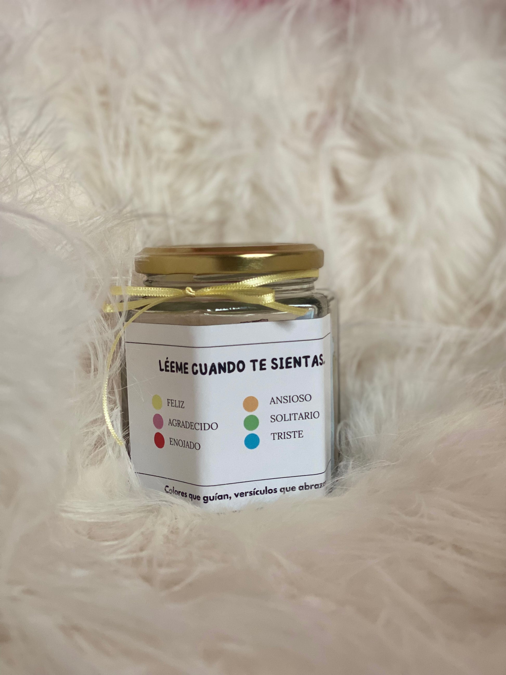 Este frasco de luz guarda en su interior 96 versículos de la Biblia, listos para acompañarte en cualquier momento de tu vida. Podés leerlos según tu estado de ánimo: